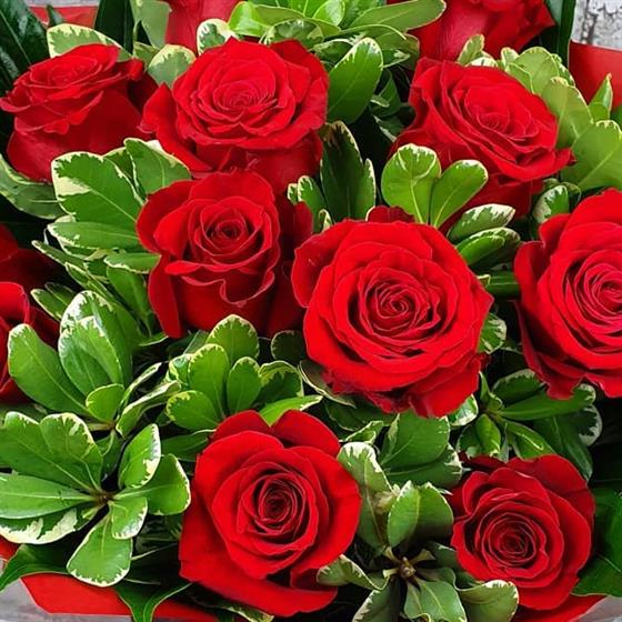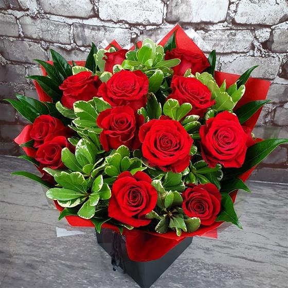 A luxurious Christmas arrangement featuring elegant 12 days of Christmas Stems red roses and fresh festive foliage, styled in a rich seasonal design. A classic and timeless choice for adding warmth and celebration to the holiday season.