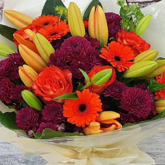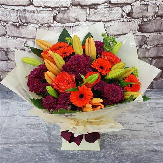 A warm Christmas arrangement filled with glowing oranges, rich mulberry tones and elegant lilies, arranged using fresh seasonal flowers and natural festive style. A vibrant design that brings cosy colour to the winter season.