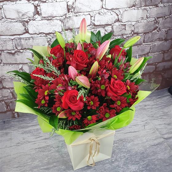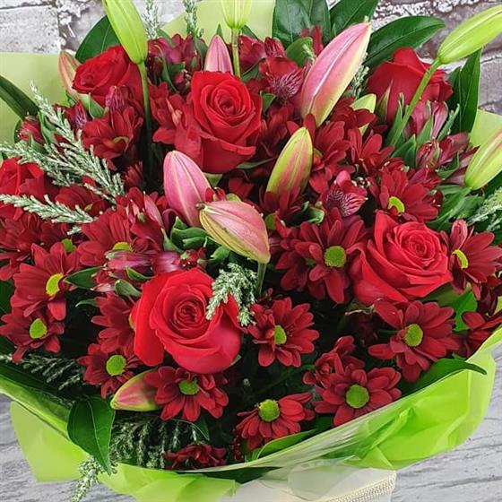 A rich Christmas arrangement filled with red roses, seasonal chrysanthemums and elegant lilies, arranged with fresh winter greens for a classic festive look. A warm and vibrant design perfect for celebrating the holiday season.