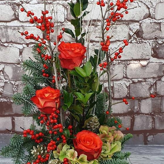 A stylish Christmas arrangement featuring vibrant red roses, festive berries, winter spruce and seasonal foliage. Designed with a classic upright style, perfect for adding warmth and elegance to the holiday season.