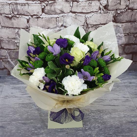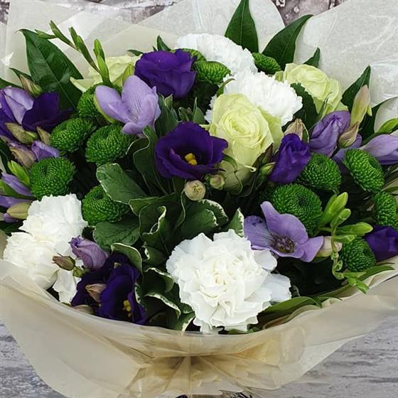 A rich winter mix of deep purples, crisp whites and fresh green tones, arranged using seasonal flowers and natural festive style. A beautiful Christmas arrangement that brings a cool, elegant glow to any home.