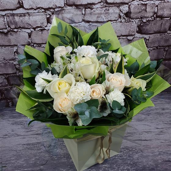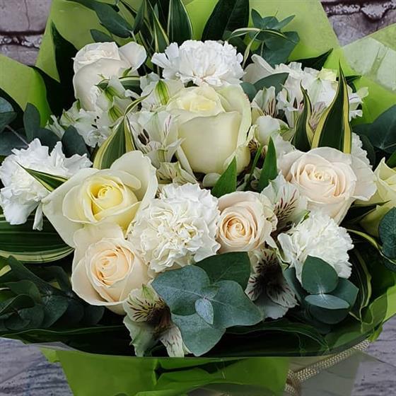 A fresh winter arrangement filled with soft white blooms, gentle creams and lush seasonal foliage for a calm, elegant Christmas look. Arranged using fresh flowers and natural style for a beautifully classic festive gift.