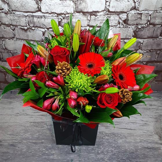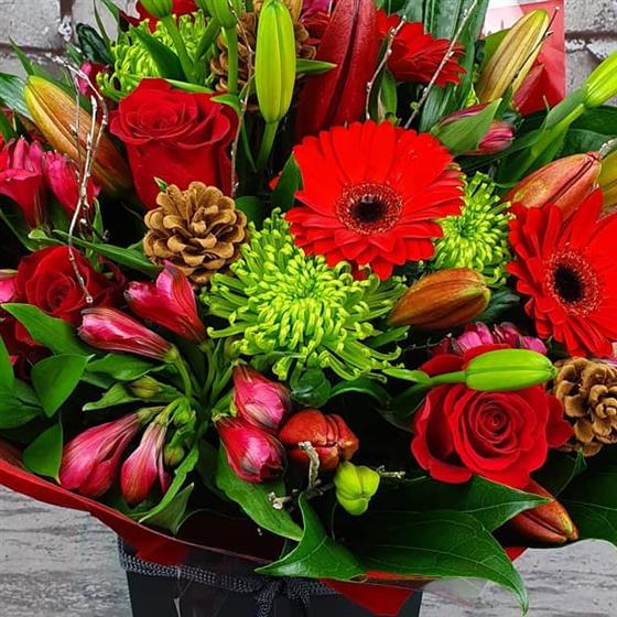 A vibrant Christmas arrangement filled with rich red blooms, bright green accents, seasonal lilies and rustic pinecones. Designed with a warm festive style, perfect for adding colour, texture and celebration to the holiday season.