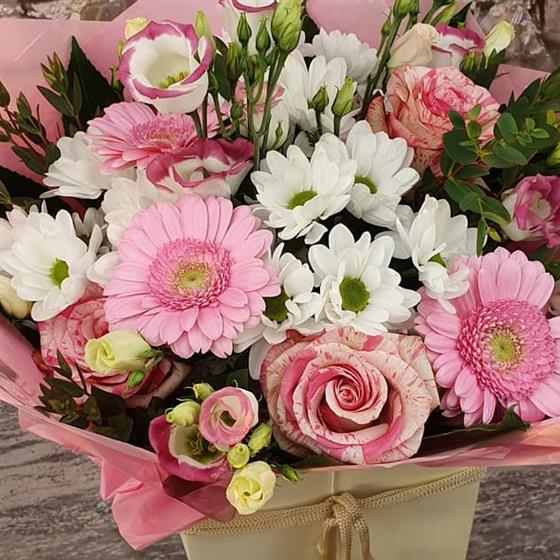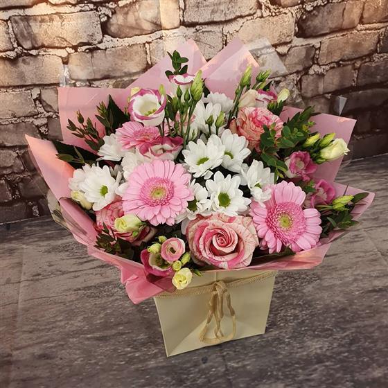 A soft and festive Christmas bouquet filled with blush pink blooms, crisp white flowers and gentle winter greenery. Designed to bring a warm, joyful sparkle to the season with its delicate colour palette and elegant style.