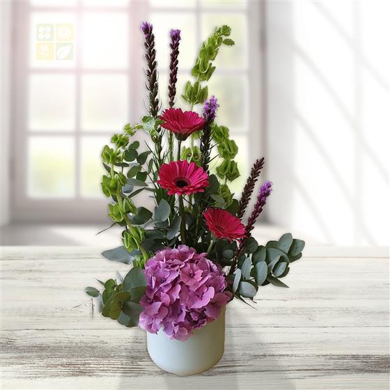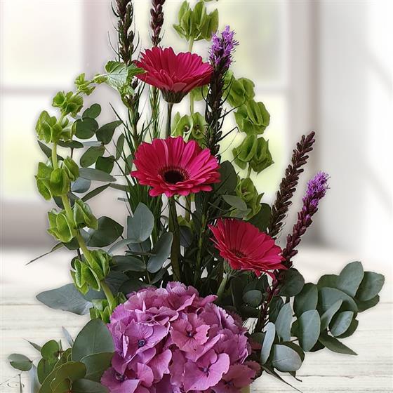 Design includes gerbera daisies, hydrangea, textured vertical stems, eucalyptus and fresh green foliage, arranged into a modern, upright display with clean lines, natural movement and a calm, architectural finish.