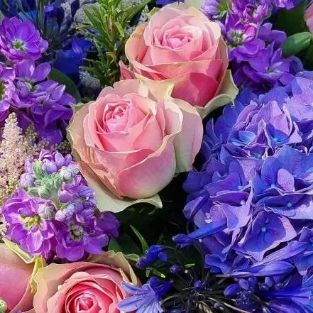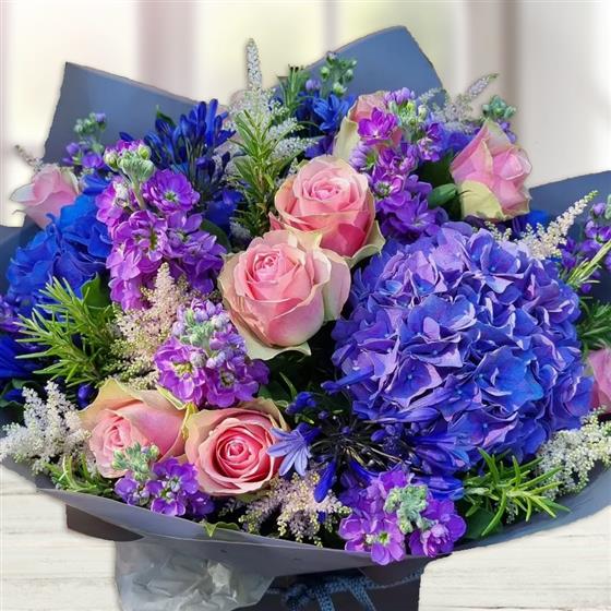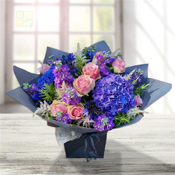 Blue Velvet Celebration dazzles with vibrant blue hydrangeas, blush-pink roses, purple stock, striking blue agapanthus, delicate astilbe, and aromatic rosemary. Elegantly arranged in a chic gift box, it’s the perfect way to celebrate any joyous occasion in style.