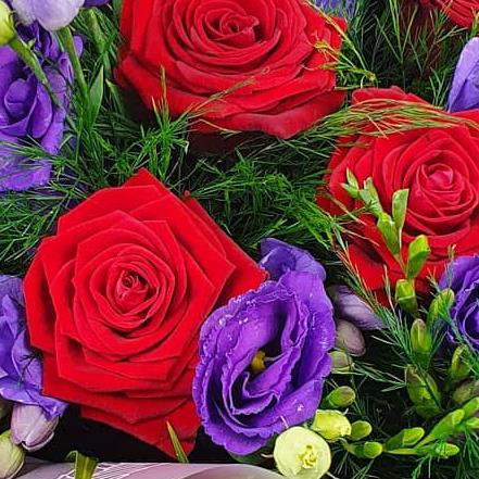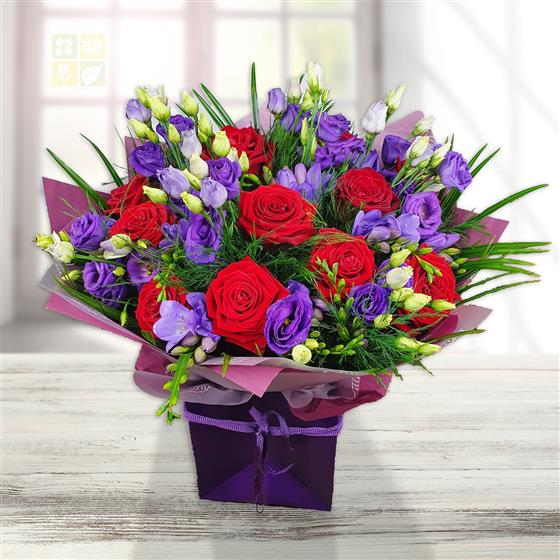 Brighten any space with rich red roses nestled among soft purple lisianthus, delicate freesia buds and textured seasonal greenery, creating a striking bouquet full of depth, contrast and elegant colour.