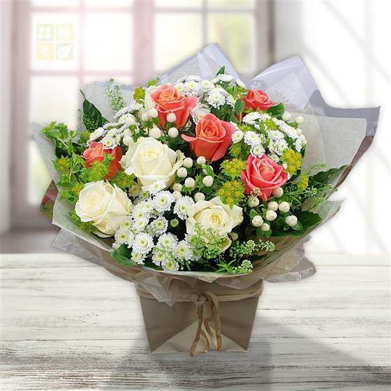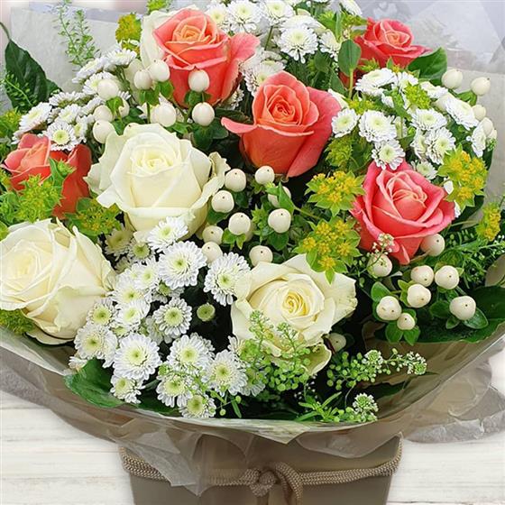 Classic Elegance features fragrant creamy white roses, coral roses, pure white spray chrysanthemums, hypericum berries, and green alchemilla nestled in lush foliage. Wrapped in elegant paper, this timeless arrangement exudes refined charm—perfect for expressing heartfelt sentiments with grace.