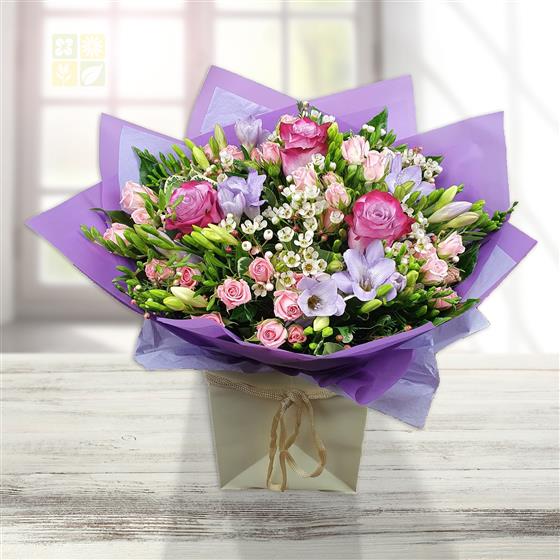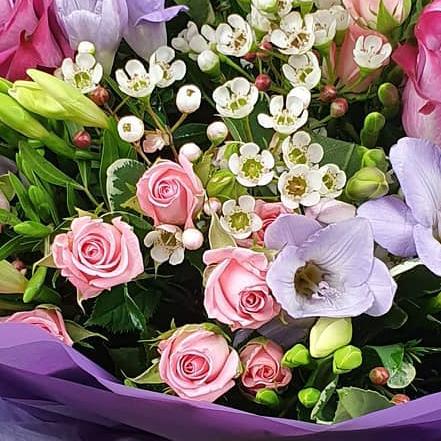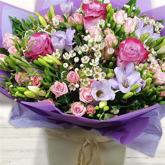Design includes pink roses and spray roses, lilac freesia, delicate waxflower buds and fresh green stems, arranged into a softly textured bouquet with light movement, gentle colour blending and a natural, garden-picked feel.