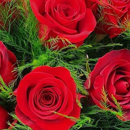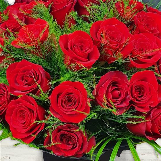 A striking flower arrangement made using premium red roses, arranged en masse and finished with soft green foliage for contrast and depth. Timeless, confident and designed to make a powerful visual impact.
