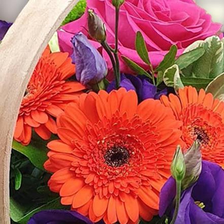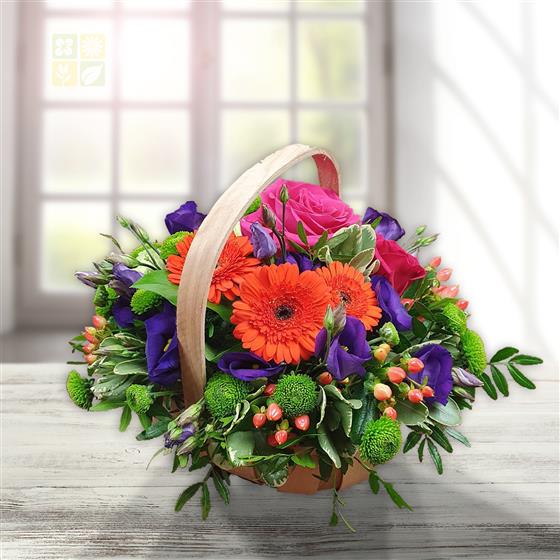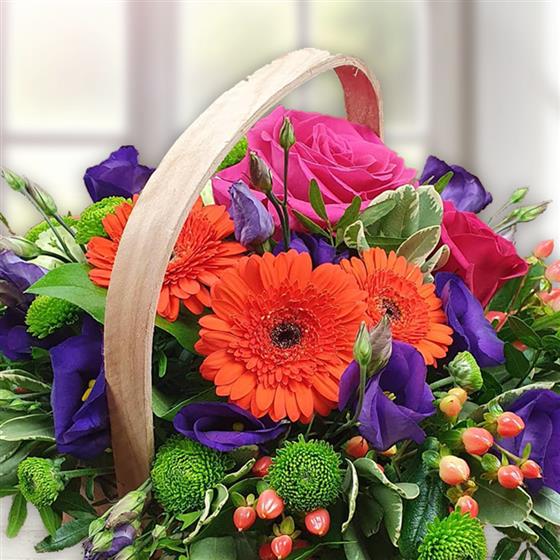 Fiery Bloom bursts with vibrant hot-pink roses and fiery orange gerberas, complemented by purple lisianthus, green button chrysanthemums, and coral hypericum berries. Nestled in a rustic basket—basket style may vary—and framed by lush variegated foliage, this radiant arrangement brings bold color and joyful energy to any occasion.