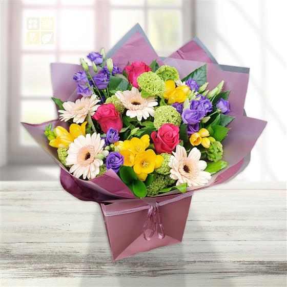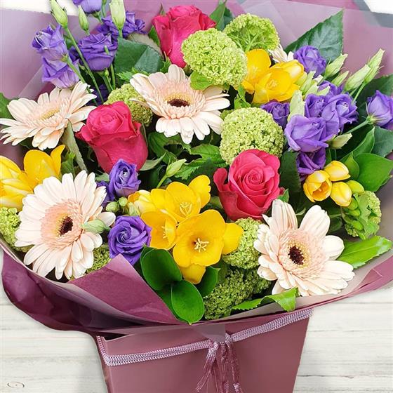 A colourful hand-tied bouquet designed with gerbera daisies, roses, freesias, lisianthus, green viburnum and mixed foliage, combining soft pastels with brighter tones for a balanced, lively floral display.