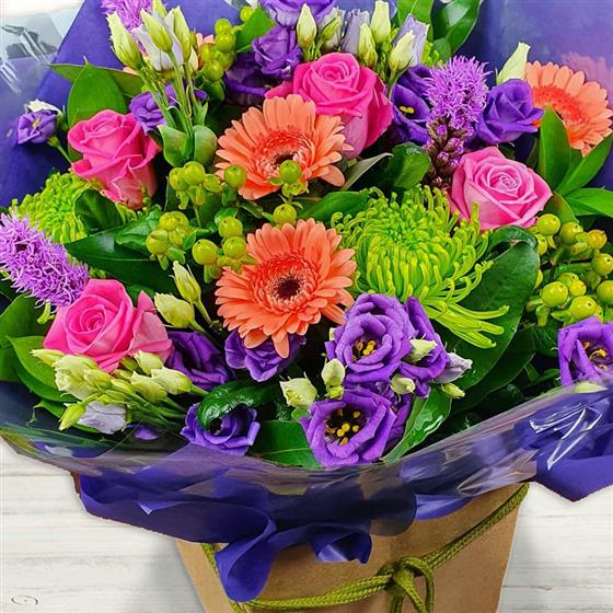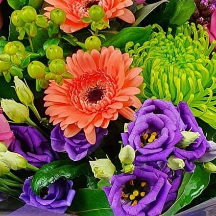 A bold mixed flower arrangement featuring roses, gerbera, lisianthus, chrysanthemums, hypericum berries and seasonal foliage. Strong colour contrasts and varied textures combine to create a lively, modern design with real visual impact.
