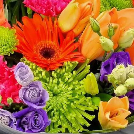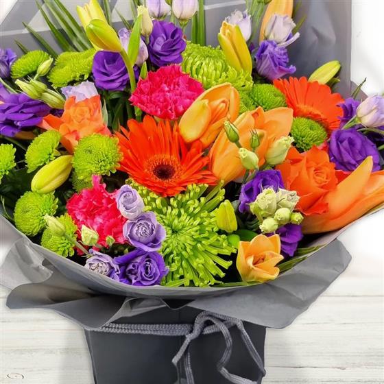 Design includes orange gerbera, orange roses, yellow tulips, purple lisianthus, green chrysanthemum blooms, pink carnations and mixed foliage, brought together in a lively, high-energy bouquet packed with colour, texture and playful contrast.