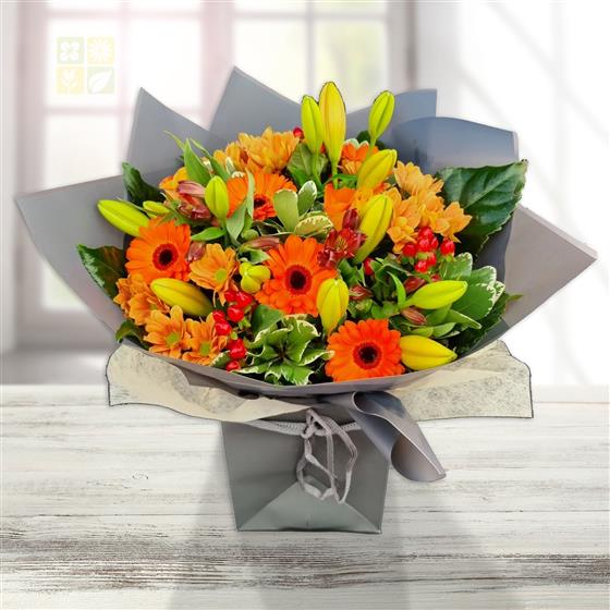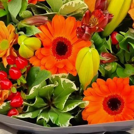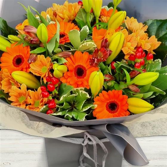A vibrant flower arrangement featuring gerbera, chrysanthemums, lilies, hypericum berries and seasonal foliage. Warm orange and yellow tones are balanced with fresh green texture to create a bold, uplifting and contemporary design.