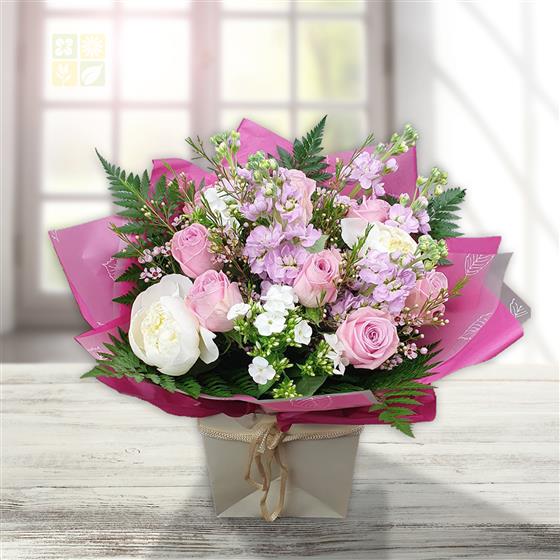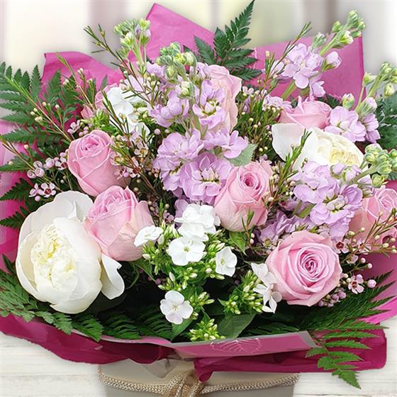 Gentle Verse combines blush roses, creamy peony, and delicate white phlox with pale pink stock, tiny waxflower, and lush fern fronds, evoking soft, poetic beauty. Please note: Peonies have limited seasonal availability and will be substituted with equally beautiful seasonal blooms when out of season.