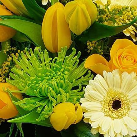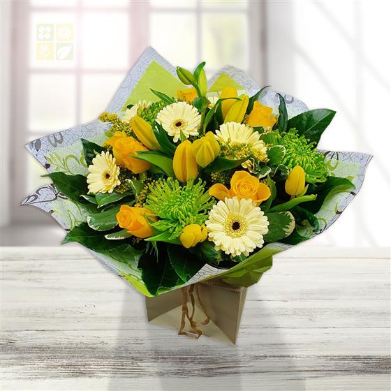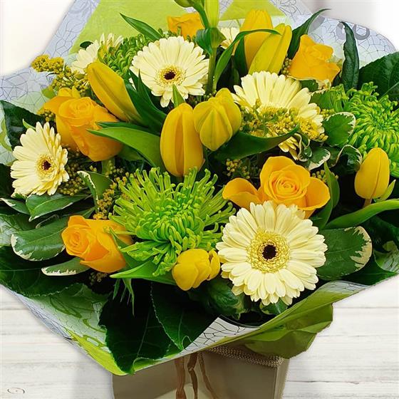 Design includes yellow roses, yellow tulips, cream gerbera, vibrant green chrysanthemum blooms, soft yellow filler flowers and glossy green foliage, arranged into a fresh, uplifting bouquet with clean colour, texture and natural balance.