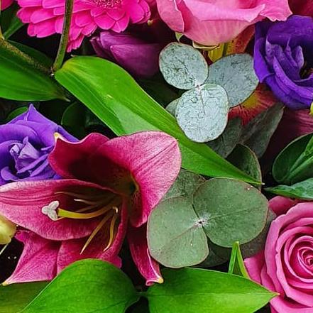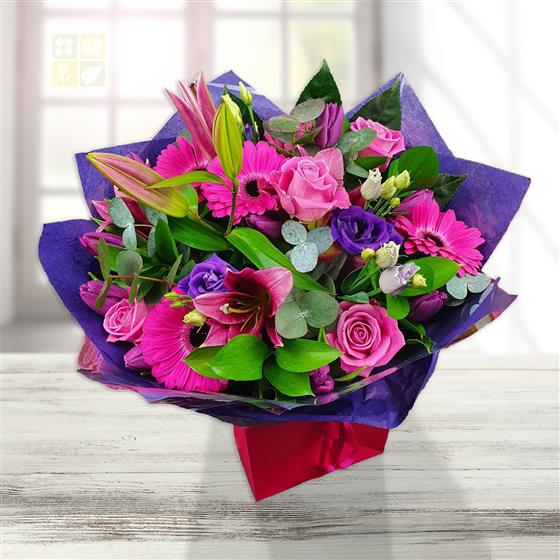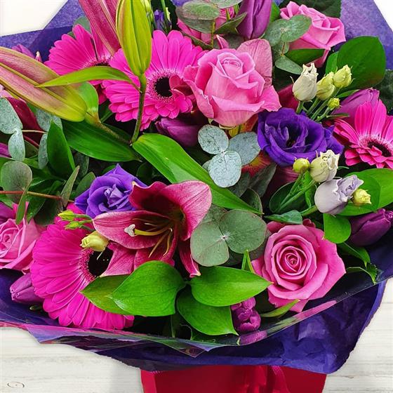 Design includes bright pink gerbera, pink roses, purple lisianthus, pink oriental lily blooms and buds, eucalyptus foliage and fresh green leaves, arranged into a bold, contemporary bouquet with strong colour, texture and lively movement.