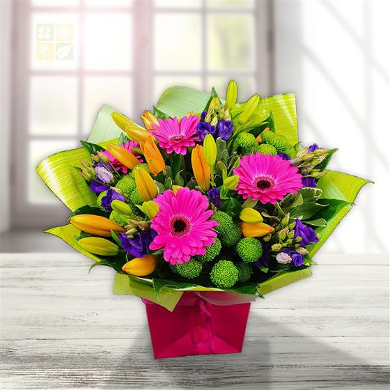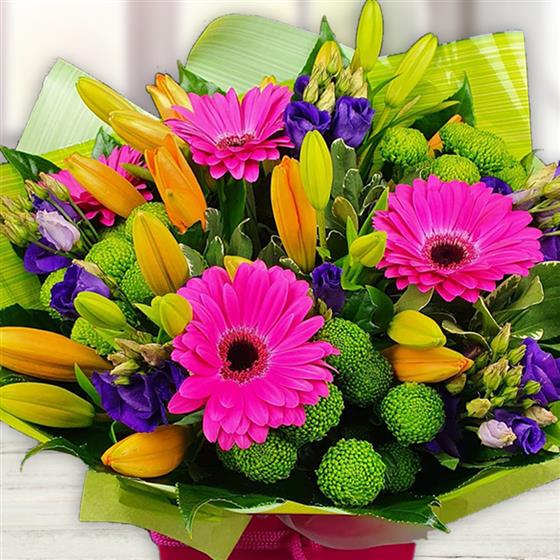 Celebrate life’s colorful moments with Joyful Burst, a lively bouquet of cheerful gerberas, lilies, lisianthus, and button chrysanthemums in bold pink, orange, purple, and green hues. Wrapped in bright paper for an extra pop of fun, this tender arrangement brings a radiant splash of happiness to any occasion.