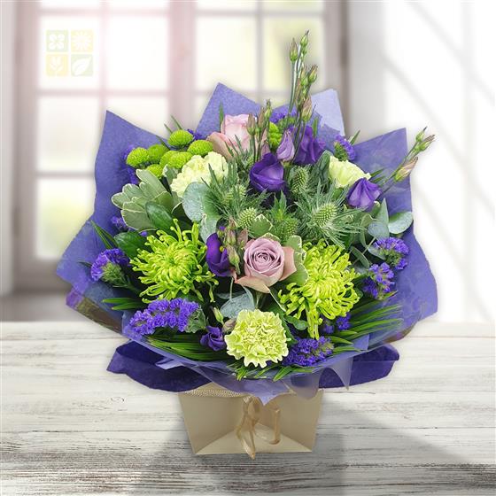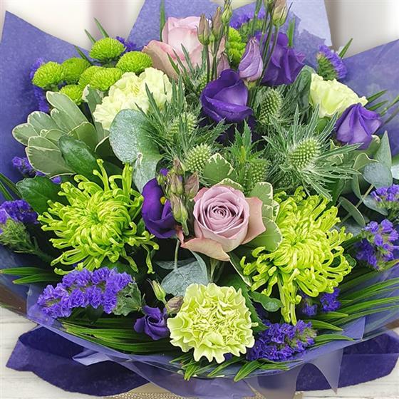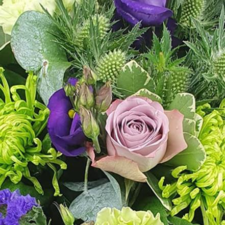 Lavender Luxe enchants with lavender roses, chartreuse spider chrysanthemums, pistachio carnations, delicate purple lisianthus, violet statice, silver eryngium, and fresh eucalyptus. Accented with lush greenery and elegantly wrapped, this opulent arrangement exudes sophisticated charm and vibrant beauty—perfect for making a memorable statement.