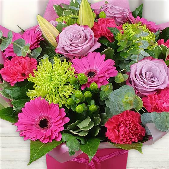Mauve Melody blends whisper-soft mauve roses, pink carnations, and hot-pink gerbera daisies with lively lime spider mums, elegant lily blooms, and delicate hypericum berries. Cradled by eucalyptus and variegated greenery, this bouquet sings with a joyful harmony of colors and textures—perfect for brightening any occasion.