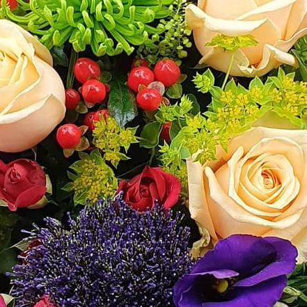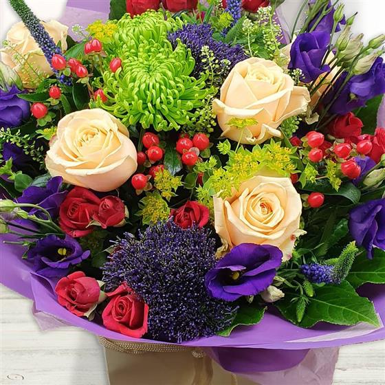 Design includes soft peach roses, rich purple lisianthus, green chrysanthemum, vibrant red spray roses, blue trachelium, hypericum berries and mixed foliage, creating a lively bouquet full of colour, texture and playful contrast.