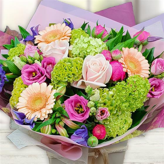 Soft and elegant, Peach Whisper features delicate peach gerberas, pastel roses, and lime hydrangea clusters, beautifully paired with magenta lisianthus, lavender freesia, and verdant leaves. Wrapped in blush paper, this bouquet offers a whisper-soft touch of sophistication—perfect for heartfelt moments and gentle celebrations.