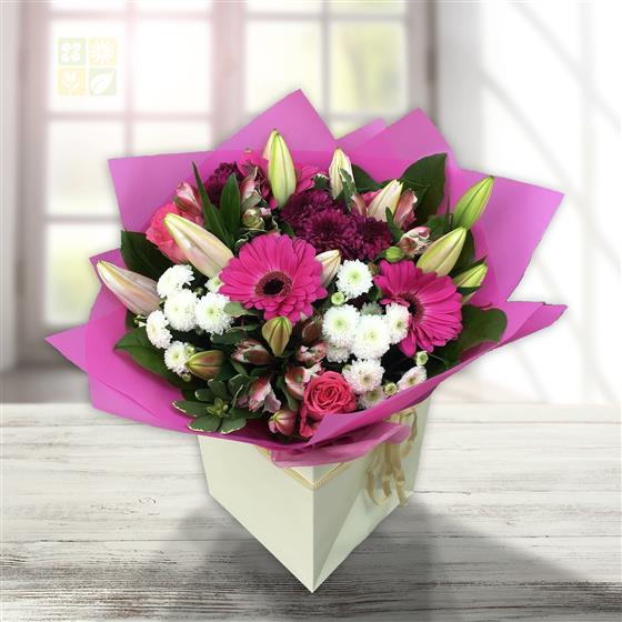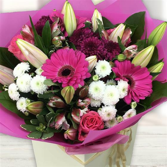 A refined expression of beauty, Plum Blush features budding Oriental lilies, cerise gerberas, pink alstroemeria, spray roses, white button chrysanthemums, and rich plum-toned blooms. Elegantly arranged and beautifully presented, this bouquet is a charming and sophisticated gift—perfect for special celebrations or simply sharing a touch of timeless grace.