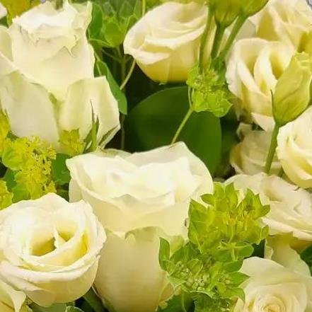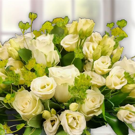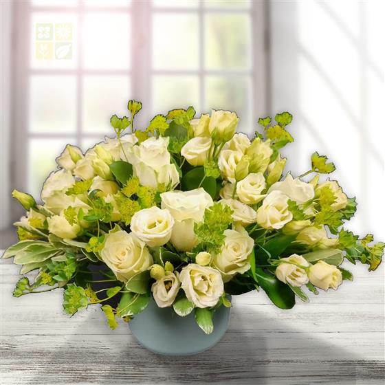 Serene Whisper features ivory roses and creamy lisianthus nestled among chartreuse viburnum clusters and lush greenery. This whisper-soft arrangement soothes the senses with its gentle, serene elegance—perfect for moments of calm and heartfelt sentiment.
