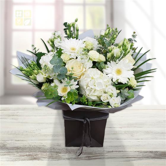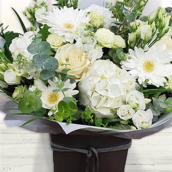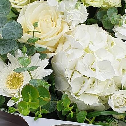 Design includes white hydrangea, cream and ivory roses, white gerbera, delicate white lisianthus, eucalyptus stems and soft green foliage, arranged into a calm, elegant bouquet with layered texture, gentle contrast and a timeless, refined finish.