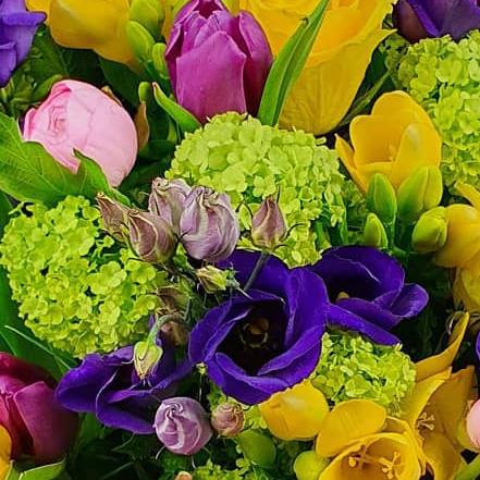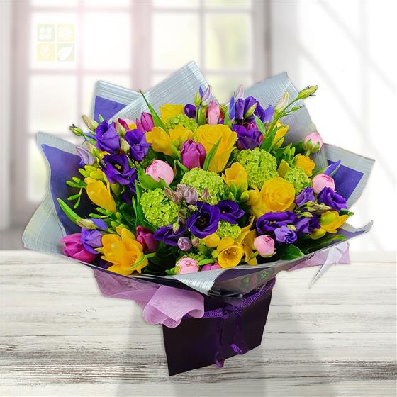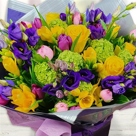 A bold, high-impact hand-tied bouquet featuring yellow roses, yellow freesias, pink tulips, purple lisianthus, green viburnum and mixed seasonal foliage, creating a lively blend of texture, contrast and confident colour throughout.