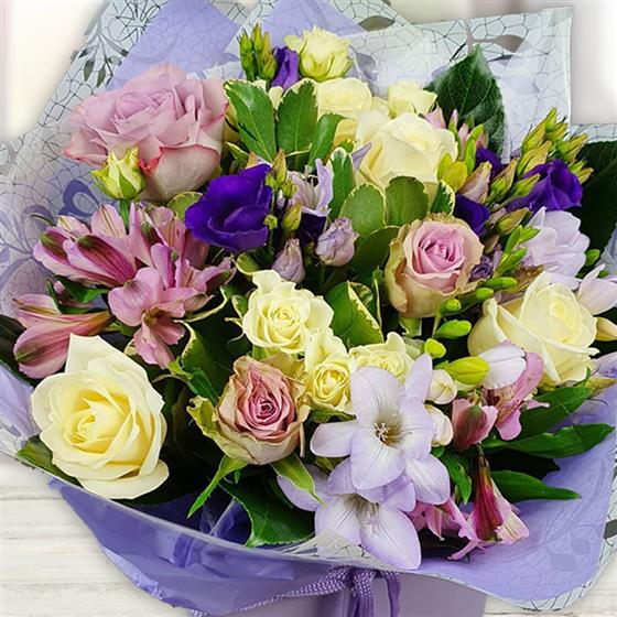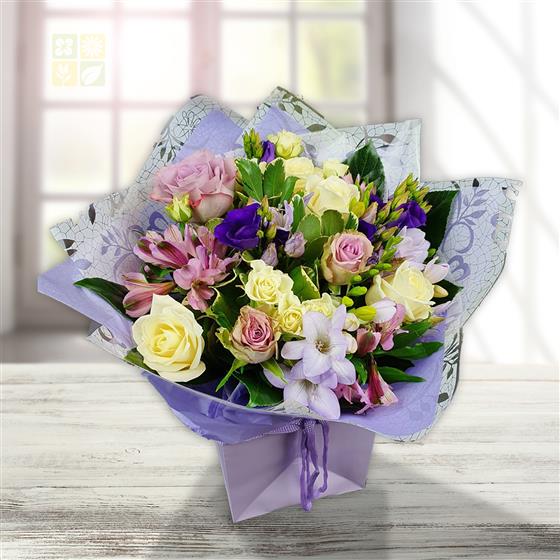 Timeless Blush combines delicate blush garden roses, ivory roses, purple lisianthus, pink alstroemeria, and lush green foliage. Elegantly wrapped in paper, this bouquet embodies soft, timeless elegance—perfect for expressing gentle sentiments with classic beauty.
