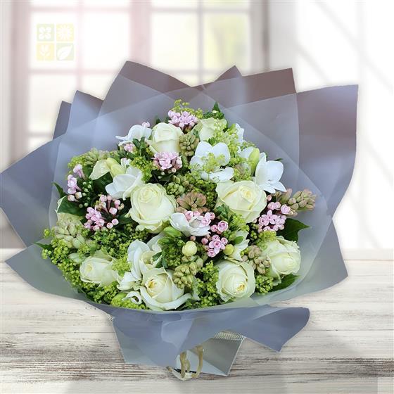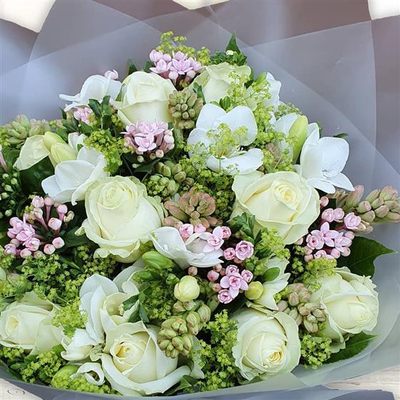 A gentle flower bouquet combining creamy roses, delicate white blooms and fresh green textures. Calm, elegant and naturally styled, perfect for thoughtful gifting and understated occasions.