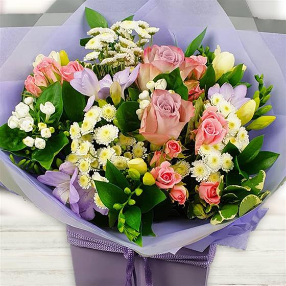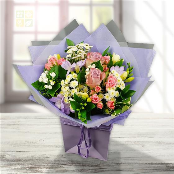 Whispering Elegance brings together blush roses, pale spray roses, white button mums, golden freesias, and lavender freesia, all gently cradled by lush greenery. This soft and sophisticated bouquet is perfect for expressing gentle sentiments with timeless grace.