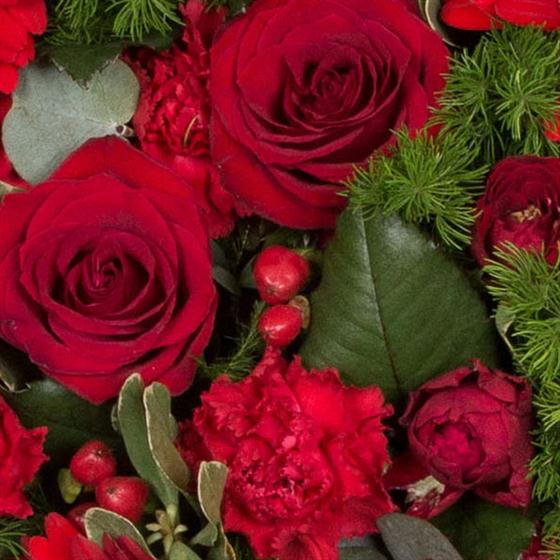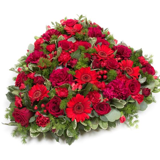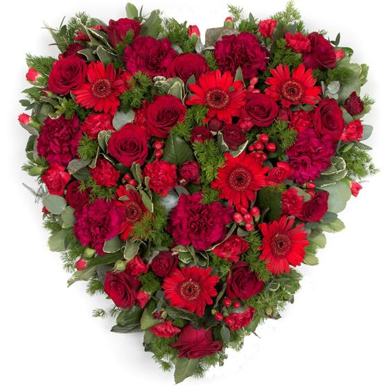 This striking red heart is crafted with a rich combination of seasonal foliage, vibrant hypericum berries, and an array of all-red blooms. A bold and heartfelt expression of love and remembrance.
