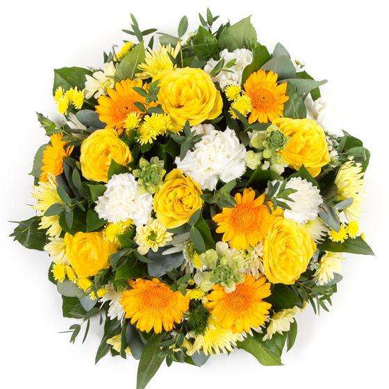 A vibrant posy arrangement blending golden roses and mini gerberas with lemon spray chrysanthemums, antirrhinums, and white carnations. This cheerful yet heartfelt tribute offers a beautiful expression of love and remembrance.
