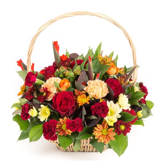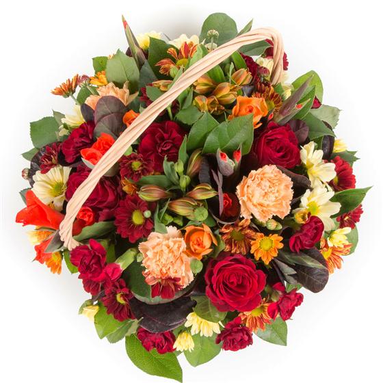 Harvest Tribute features a rich mix of deep autumnal reds, rusts, and golds, combining roses, spray carnations, alstroemeria, and chrysanthemums. Presented in a charming basket (which may vary), this arrangement offers a warm and heartfelt farewell.