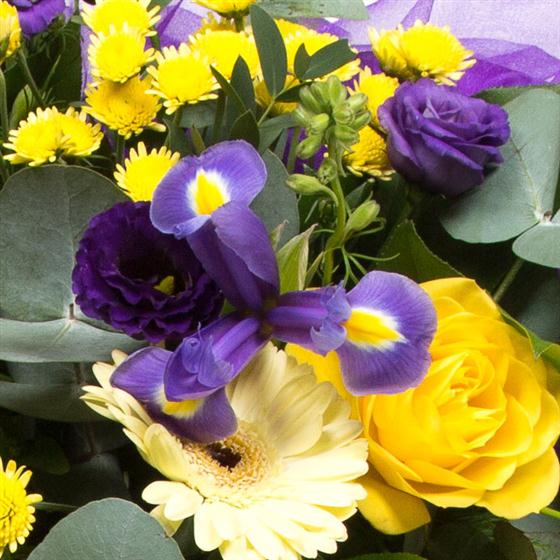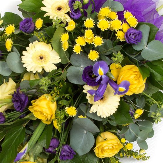 A vibrant tribute crafted from seasonal blooms in rich purples, soft lilacs, and contrasting gold and lemon tones. A radiant expression of remembrance and love.