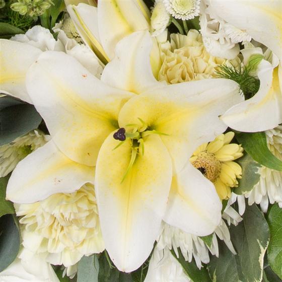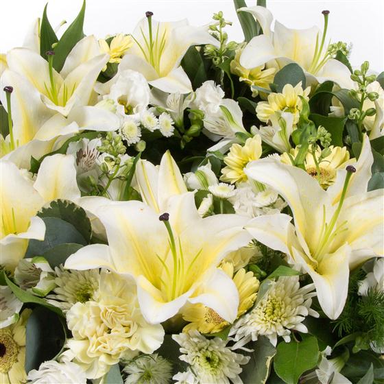 A subtle blend of lemons and creams, featuring lilies and alstroemeria, beautifully combined with delicate solidaster. This elegant wreath offers a graceful and heartfelt tribute.