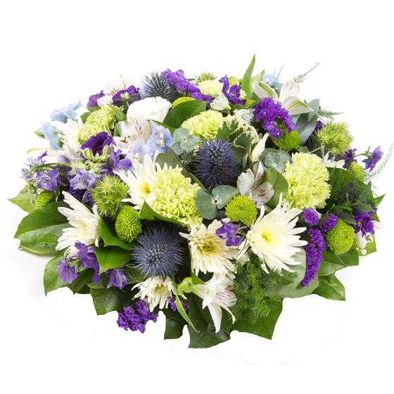 A mixed posy arrangement in refreshing limes, gentle whites and soft purples, featuring thistles, alstroemeria, statice and lisianthus. A serene and thoughtful tribute filled with natural charm.