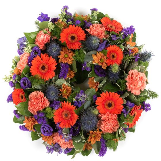This traditional wreath blends thistles, statice, deep purple lisianthus, carnations, and mini gerberas to create a strong, masculine tribute. A dignified expression of remembrance with rich, bold tones.