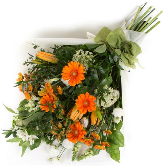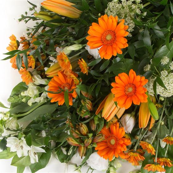 A vibrant funeral sheaf featuring a lively selection of orange and white blooms, including mini gerberas and lilies. This cheerful tribute offers a warm and heartfelt farewell.