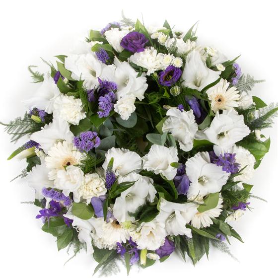Crisp whites, soft lilacs and rich purples are beautifully arranged with mixed seasonal foliage to create this traditional, elegant wreath — a serene tribute of love and remembrance.