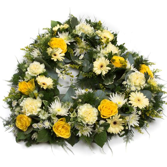 A mixed open heart tribute featuring a selection of unusual greenery as its base. Delicate accents of solidaster, nigella, and asparagus fern complete this graceful arrangement. Available as pictured or in your choice of colors.